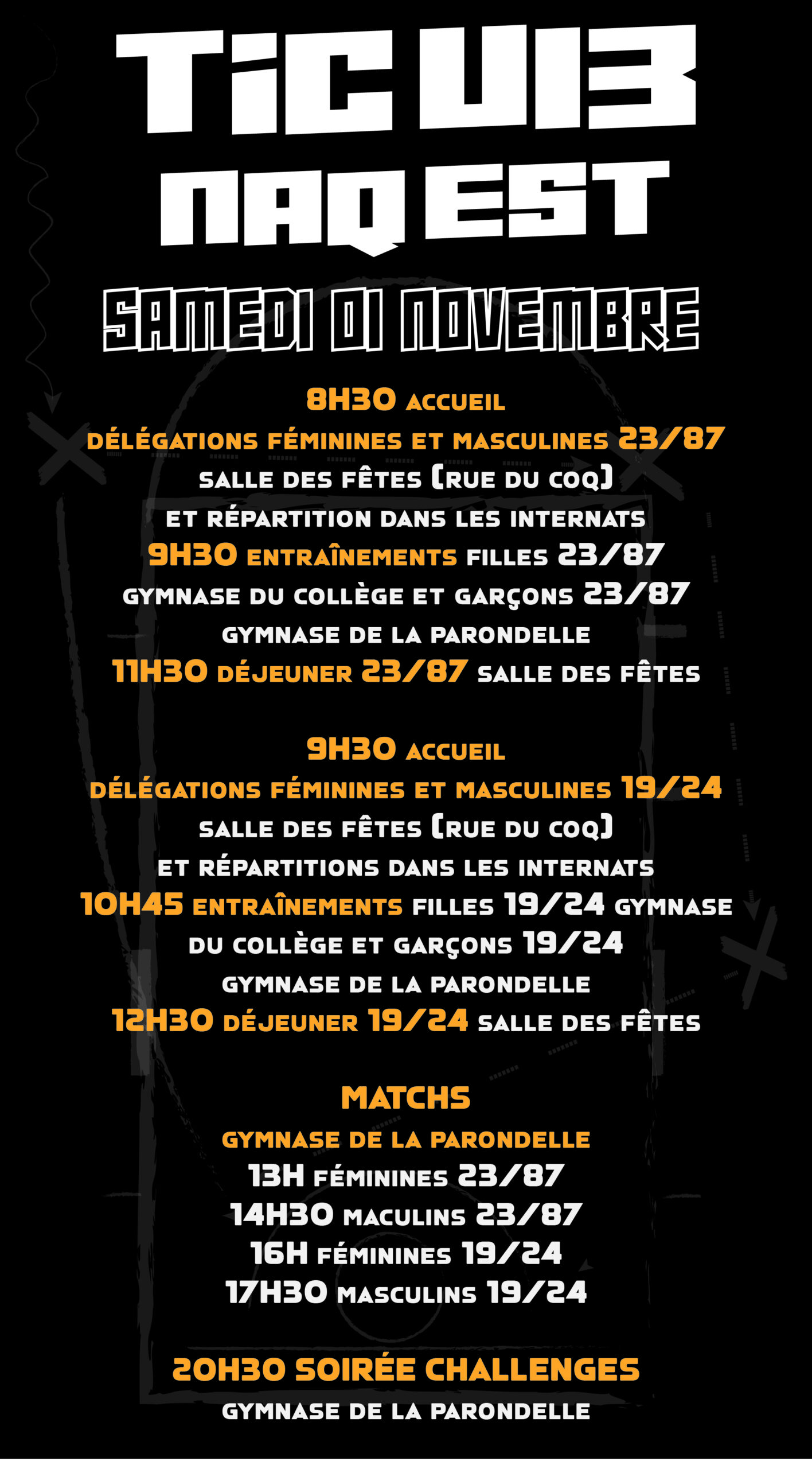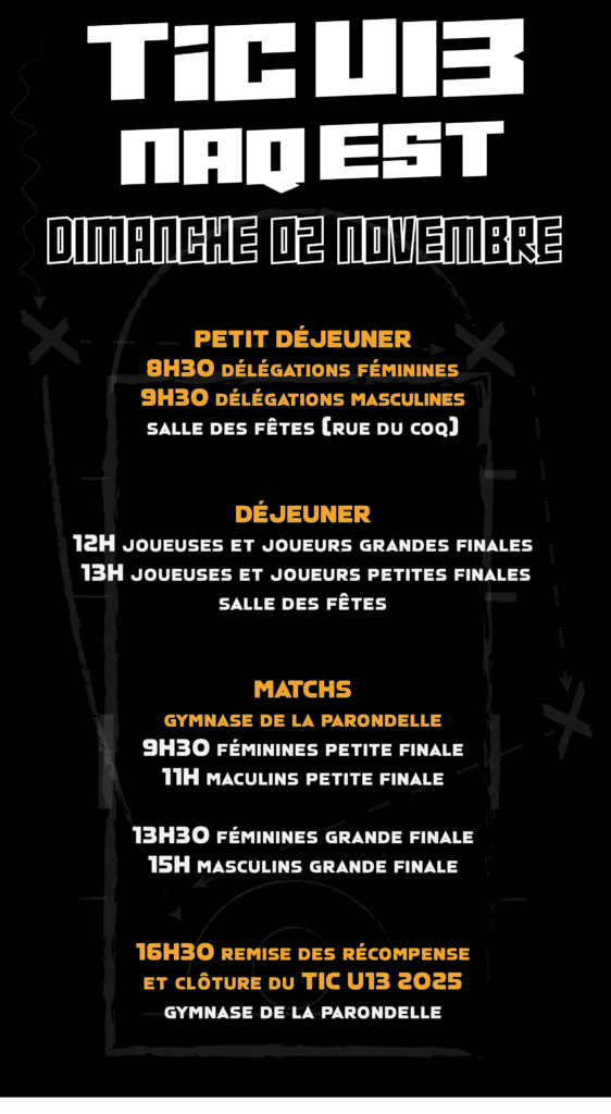 Génération 2013 Le TIC U13 fait son grand retour dans sa formule sur 2 jours.Le programme des rencontres reste inchangé, demies finales pis finales, mais seulement un match par jour.Pendant ce temps là, les jeunes profiteront d’entraînement collectifs, ouvert aux entraîneurs des clubs souhaitant profiter de ce moment.Le samedi soir, afin que ce moment reste inoubliable, nous organiserons des concours, ouverts au public !Rendez vous à La Souterraine les 1er & 2 novembre. TIC 1er & 2 Novembre 2025 CHALLENGES TIC U12 Juin 2025 Sélections féminines Sélections masculines