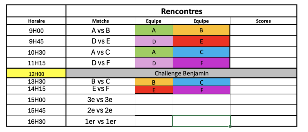 Le planning des rencontres (identique pour les deux tournois)